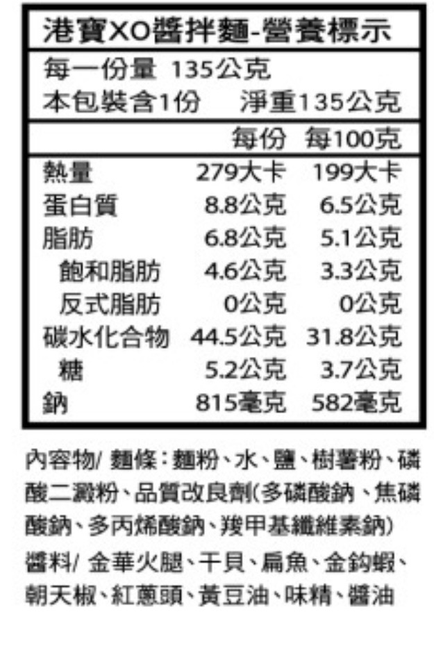 麵條成分:麵粉、水、鹽、樹薯粉、磷酸二澱粉品質改良劑(多磷酸钠焦磷酸鈉丶多丙烯酸鈉、羧甲基纖維素鈉)